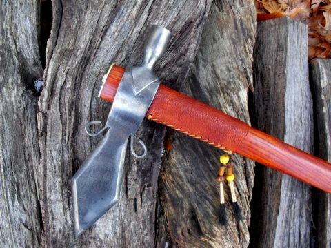 Native-American Pipe Spontoon-Tomahawk. This is a brand new, original, historically influenced, hand-forged pipe-tomahawk that I forged in my blacksmith shop, The North River Forge. I specialize in hand-forged reproductions of the 18th and 19th centuries. They have an authenticity rarely found in other maker's work. Each piece is unique. Dimensions: Head overall 9 3/4" - Round bowl is 5/8" diameter, inside. Haft: Osage orange wood, 18" long. Drilled. Construction: Traditional 18th. century construction. Head is hand-forged from 1018 steel. Finish: Aged finish. Period correct. Special Features: Hand filed chevrons. Buffalo hide wrap. Decorated with copper cones, horse hair tassels and trade beads. Solid brass end cap and threaded clean out plug. The pipe is fully functional and can be smoked. This spontoon-tomahawk is stamped with my makers mark NR. Great for re-enactors or collectors who crave tradition. Hand-forged in the traditions of long ago. It is a reminder of an era past. A very nice reproduction pipe hawk. It has never been carried or used. Functional as well as beautiful. A classic 18th century design. Price: $375.00 plus $18 shipping with insurance. (USA - Canada) Please contact us for shipping charges and options for other destinations.