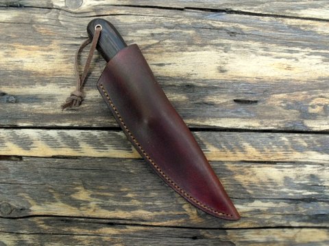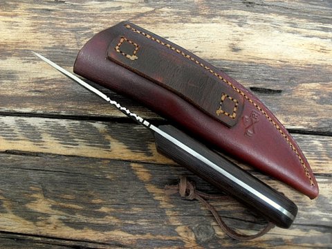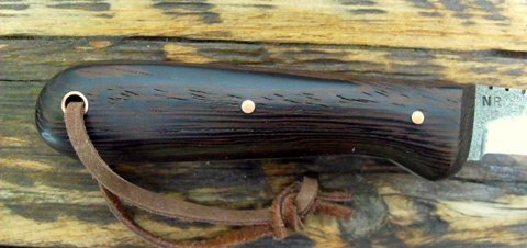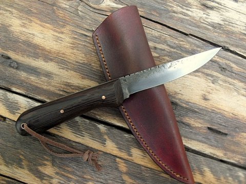 Blade: 1095 high carbon steel. Differentially tempered. Cutting edge tempered to Rc 59-60. Construction: Full Tang. Dimensions: Blade 4 1/16" - Handle 4 7/16" - Overall 8 1/2" - Width 3/4" - Thickness 3/32" Scales: Wenge, secured with two copper pins. Sheath: Handstitched 7-8 oz. Veg tan leather with a welt. Finish: Forge finish with hammer marks. Special Features. Filework on blade. Copper lined lanyard hole. This hand forged knife is stamped with my maker's mark “NR” and comes with a certificate of authenticity. Great for cleaning your fresh caught trout or to field dress that quail. Hand-made in the traditions of long ago. A nice hand-crafted knife for the hunter/fisher person. Very sharp. Price $230.00 - FREE SHIPPING TO THE USA AND CANADA