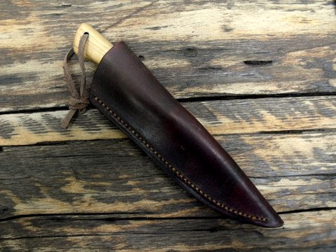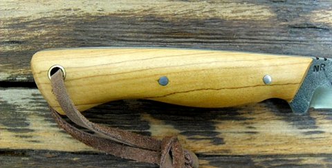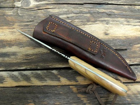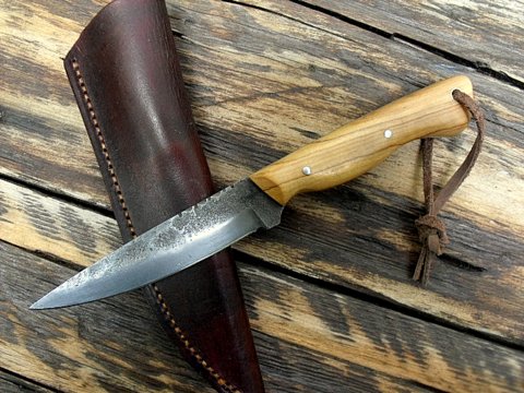 Blade: 1095 high carbon steel. Differentially tempered. Cutting edge tempered to Rc 59-60. Construction: Full Tang. Dimensions: Blade 4 3/16" - Handle 4 1/4" - Overall 8 7/16" - Width 1" - Thickness 3/32" Scales: Olive wood, secured with two iron pins. Sheath: Handstitched 7-8 oz. Veg tan leather with a welt Finish: Forge finish with hammer marks. Special Features. Filework on blade. Brass lined lanyard hole. This hand forged knife is stamped with my maker's mark “NR” and comes with a certificate of authenticity. Great for cleaning your fresh caught trout or to field dress that quail. Hand-made in the traditions of long ago. A nice hand-crafted knife for the hunter/fisher person. Very sharp. Price $230.00 - FREE SHIPPING TO THE USA AND CANADA
